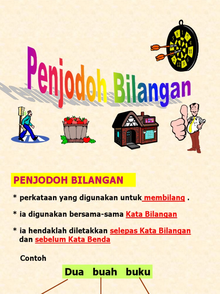 Untuk benda yang tidak tentu bentuk atau jenisnya. Penjodoh bilangan ialah perkataan yang digunakan berpasangan dengan kata. LANGKAH 4 Dengan menggunakan powerpoint setiap anggota 10minit kumpulan akan mendapat peluang untuk memilih nombor soalan yang tertera.